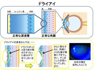近年、メディアでも取り上げられることの多いドライアイですが、ここで詳しくご説明したいと思います。まず、ドライアイの定義ですが、『ドライアイとは,様々な要因による涙液および角結膜上皮の慢性疾患であり,眼不快感や視機能異常を伴う』とされています。これはドライアイ研究会という、日本のドライアイを専門にする偉い先生方の集まりで定義されたものです。わかりやすく言うと、『いろいろな理由により』、『涙が量的に少なくなることで乾燥しやすくなったり(涙液減少型ドライアイ)』、『涙の成分が変化し眼表面から涙が蒸発しやすくなる(蒸発亢進型ドライアイ)』ことで、『角膜や結膜に障害がおよび』、それに付随した『自覚症状』があることというのがキーワードとなります。