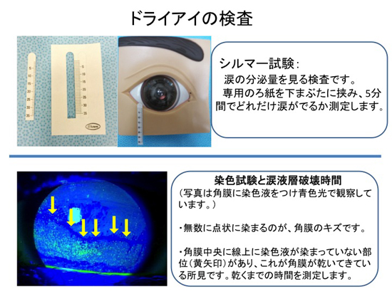 前述した染色液を用いて、眼表面の涙液層を染色します。その状態で、瞬きをしないようにして角膜が乾き始めるまでの時間を測定します。10秒以上が正常値となります。