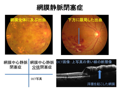 病名のとおり、網膜の静脈がつまってしまう病気です。静脈閉塞が起きる部位の違いで病状に大きな差が出ます。