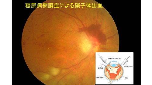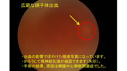 治療は、原疾患の治療を行いますが、出血量が多いと眼底検査でも何が起きているかわかりません。経過をみて出血がひかない場合には、硝子体手術に踏み切り、血の混ざった硝子体を切除します。すると、眼内の視認性がよくなり、病態が確認でき診断が確定することもあります。一方で、手術を行わなくても、出血が吸収されることもあり、消退したのち原疾患の治療をすることもあります。