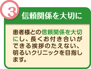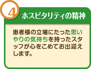 皆様からも愛される、雰囲気の良い、そして何より『受診してよかった』と思って頂けるクリニックを目指しスタッフ一同励んでまいります。行き届かなかったことなどありましたら、お気軽にお申し出ください。皆様の声に耳を傾け、当院は成長していきます。何卒、宜しくお願い申し上げます。